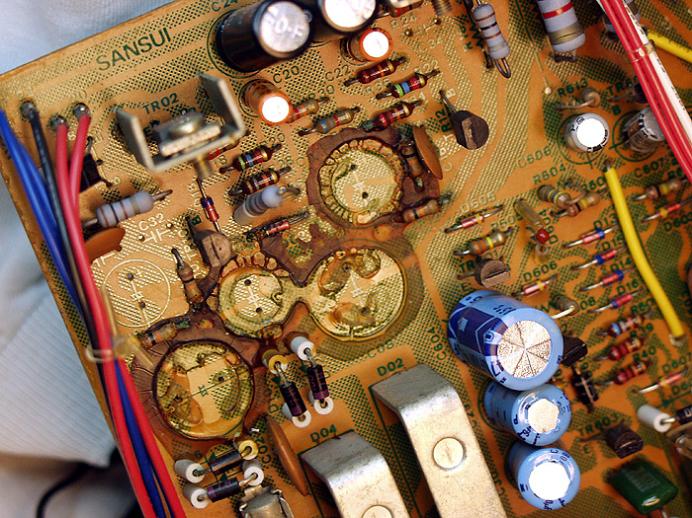 become conductive as it dries and ages. Often, you will see the component leads with a fuzzy blue-green