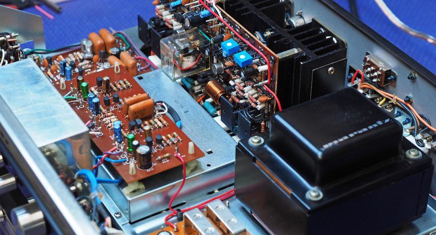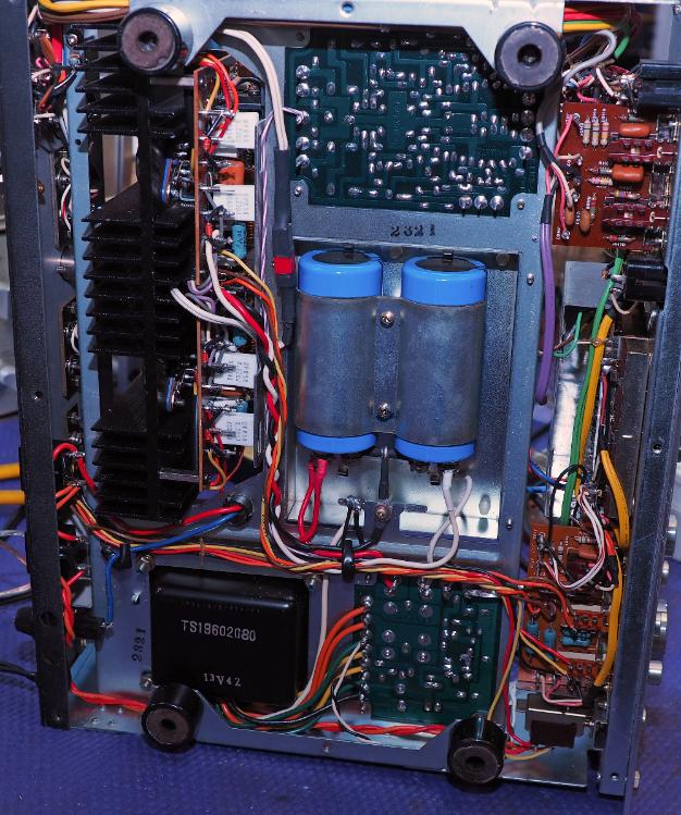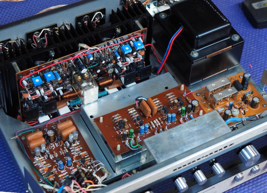 Here, you can see the new trimmers (blue square components) installed on the amp board. The relay was removed,