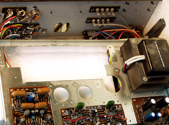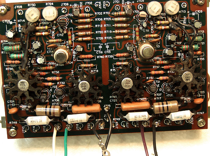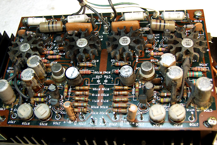 Here is a picture of the amp board prior to work. Minor dust, but lots of old caps and glue... and