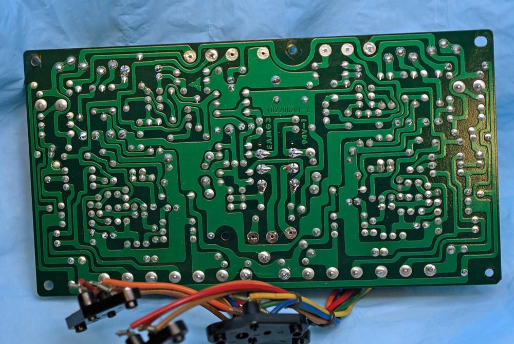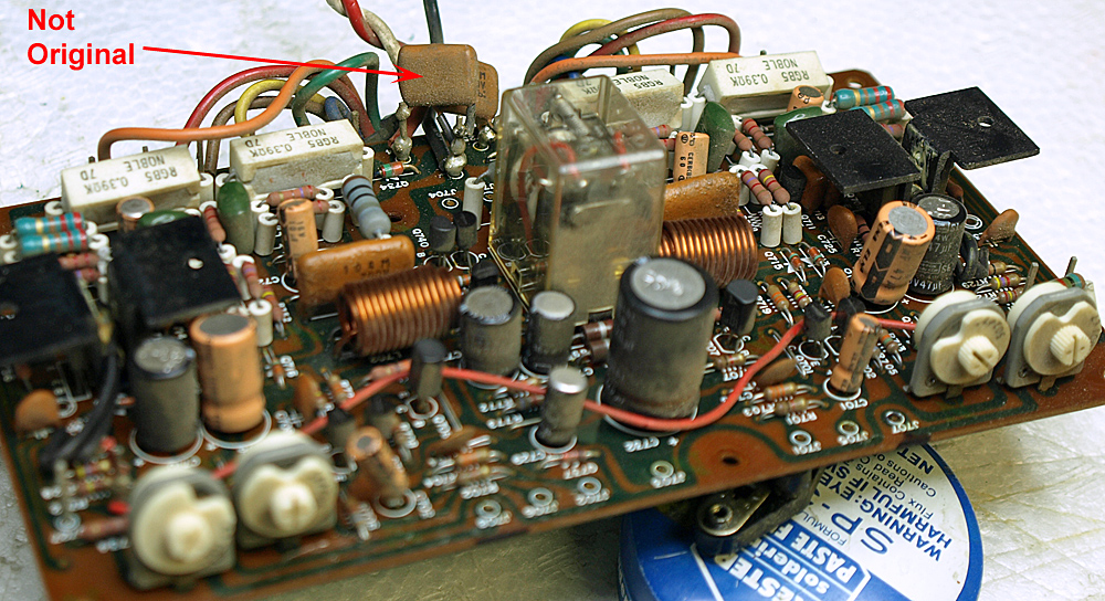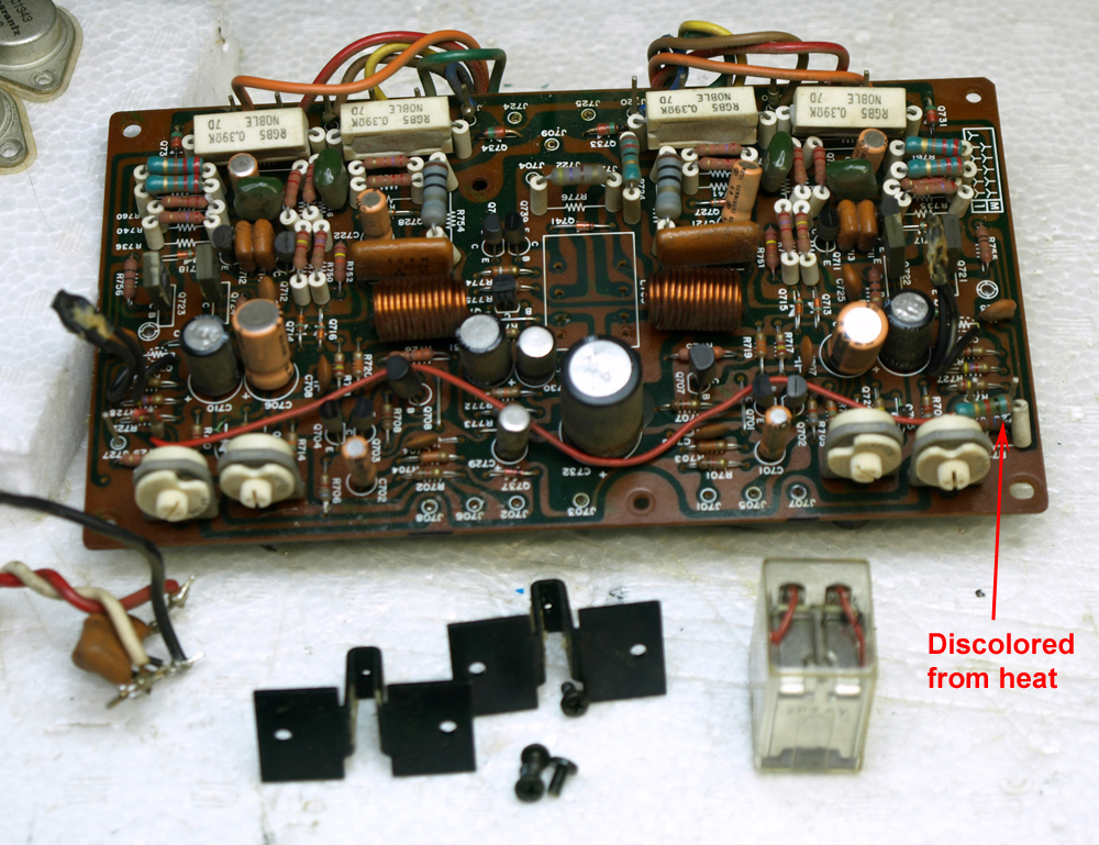 Hardware is removed from the PCB to allow for cleaning and work. 1) rail supply wires and by-pass caps, 2) heat syncs, 3) relay