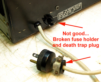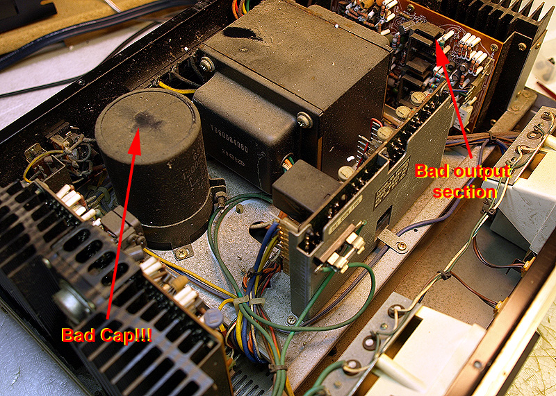 * Broken fuse holder * 220V plug was cut off and replaced * Dead right channel * Rust & pitting * Bad primary power suppply capacitor (Ouch!!!) |